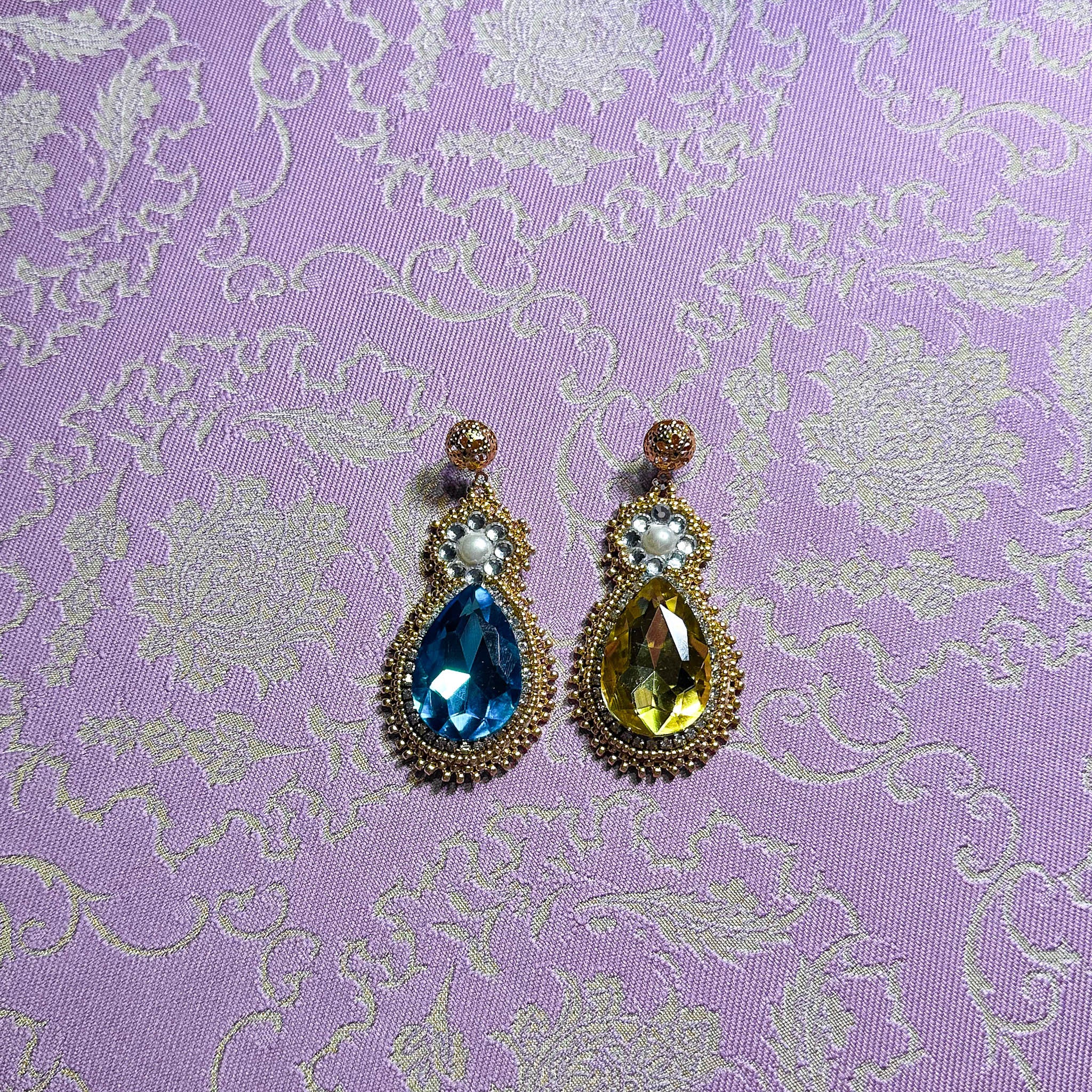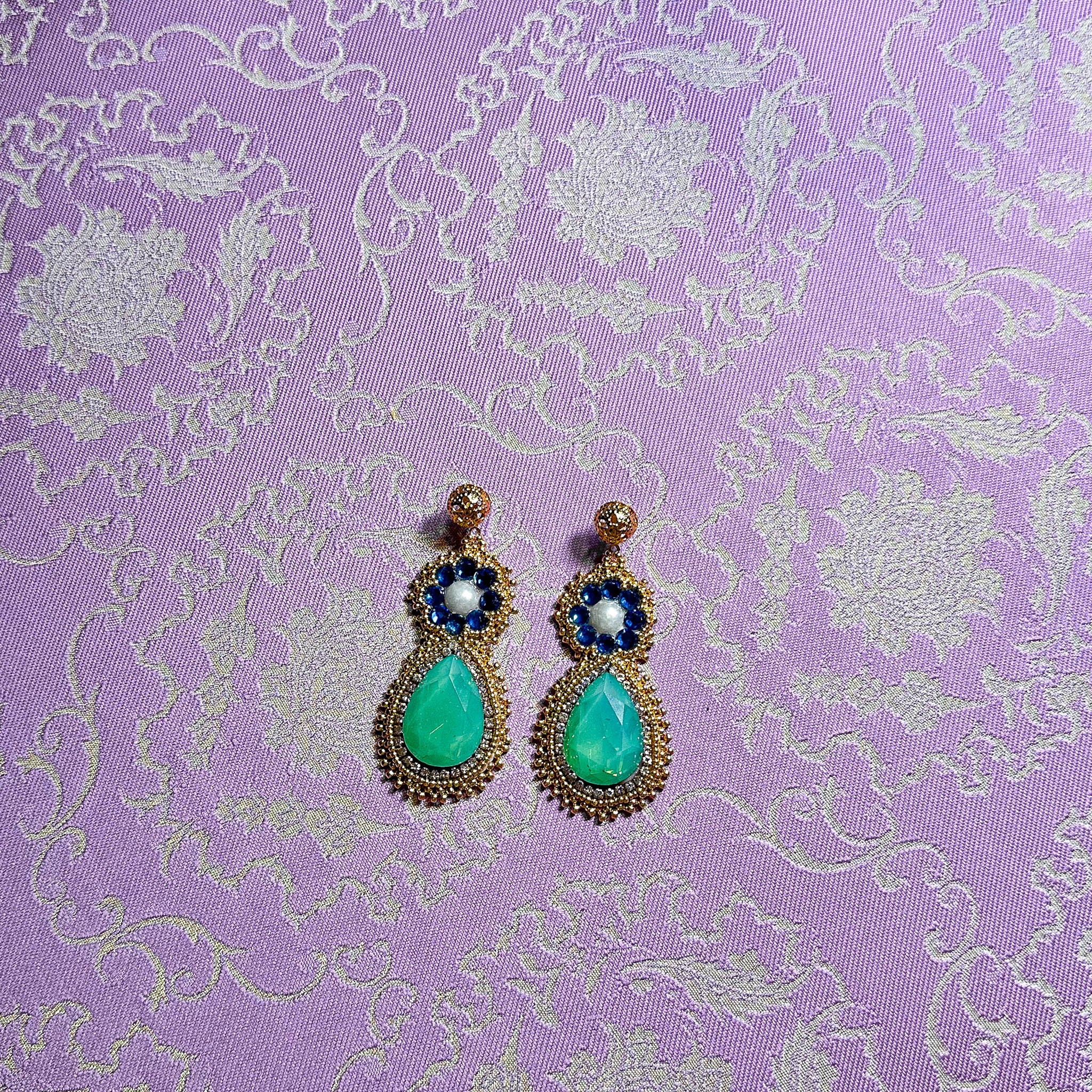 These earrings are part of our Oolong Tea Time Drop. Portraying Kwan Yin, the goddess, in her princess era, making all these eye candy jewels the boldest, most opulent collection yet. Full of meaningful colors, gold beads, pearls, shiny crystals, & and the most wonderful loving and healing energies