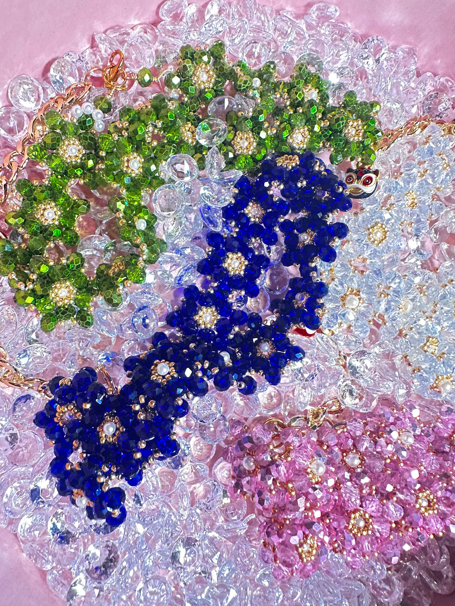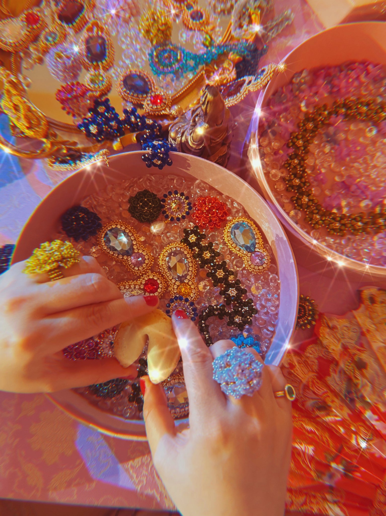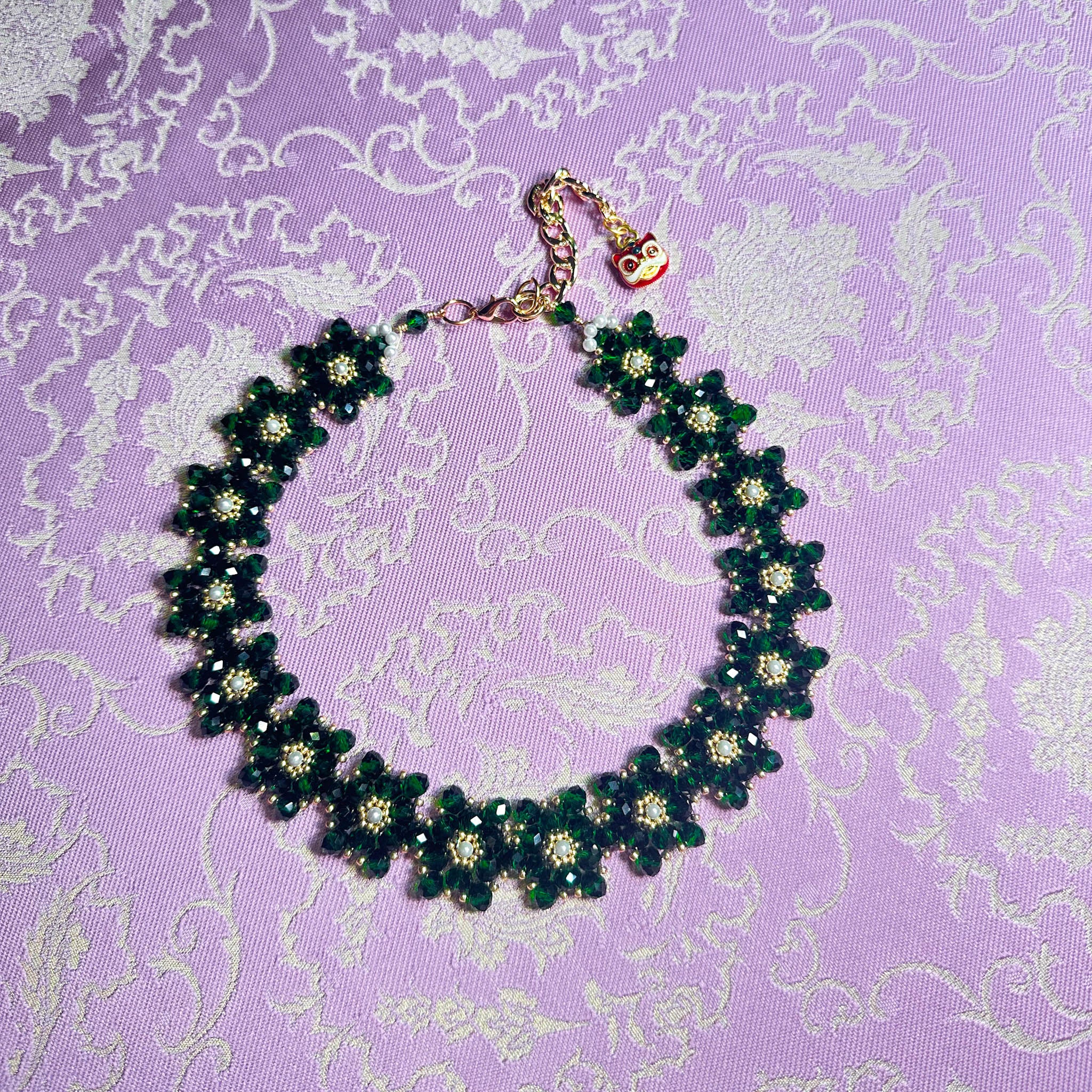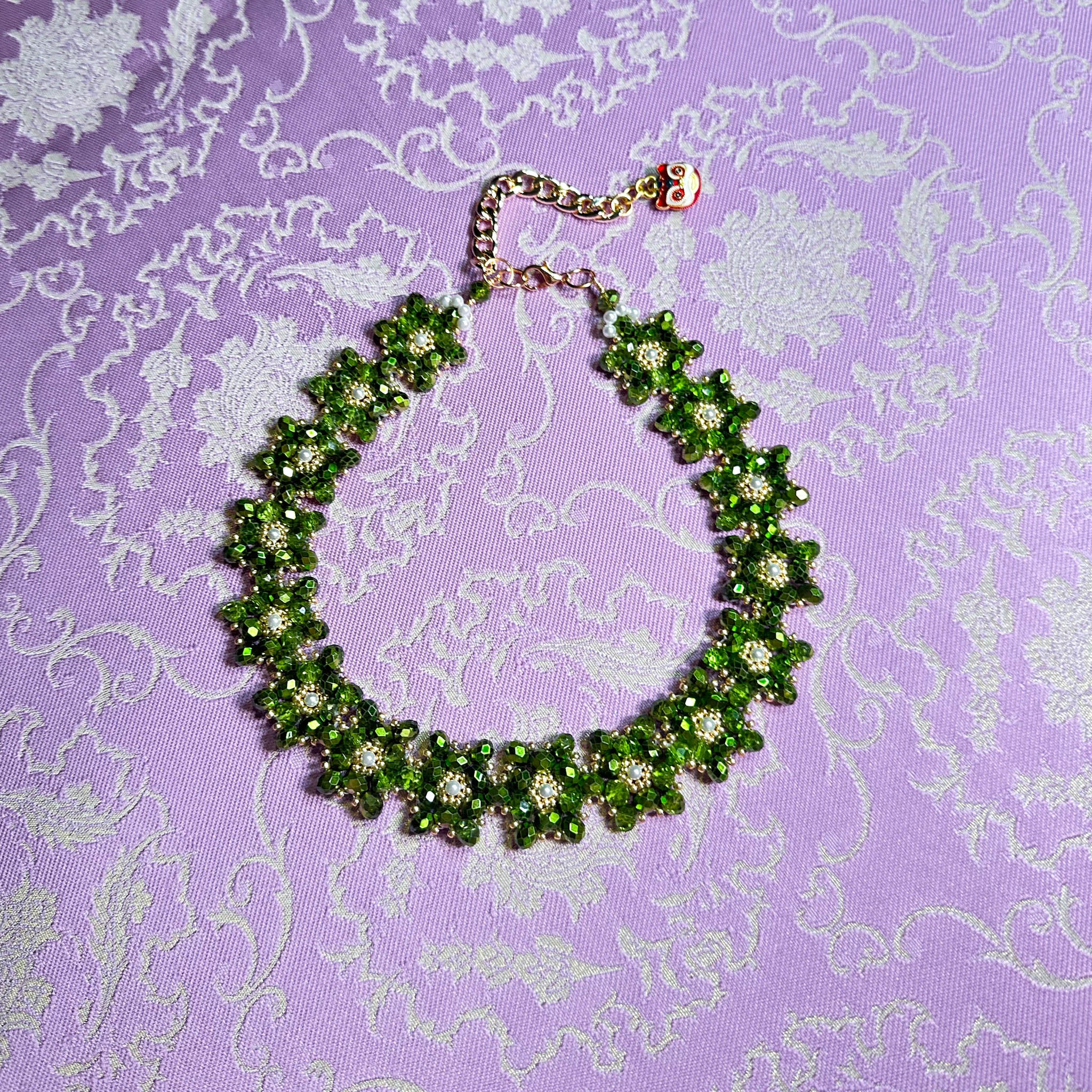 The Imperial Chokers are part of our Oolong Tea Time Drop, featuring Kwan Yin, the goddess, in her princess era. This opulent collection boasts gold beads, pearls, shiny crystals, and meaningful colors, exuding loving and healing energies.